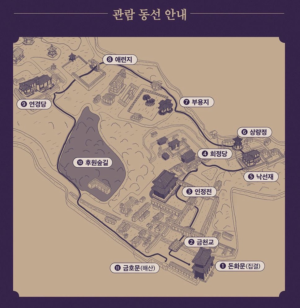 달빛기행 코스 : 돈화문 → 진선문 → 인정전 → 희정당 → 낙선재 → 상량정 → 부용지 → 애련정과 애련지 → 연경당 → 후원 숲길 → 금호문